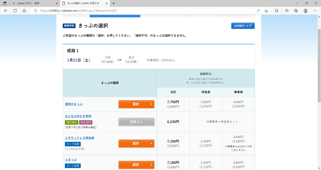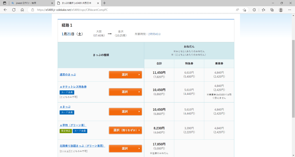 ↓ 大阪駅~金沢駅間 J-WESTカード会員運賃J-WESTカードのe早割(グリーン車)で大阪駅と金沢駅間を予約した場合