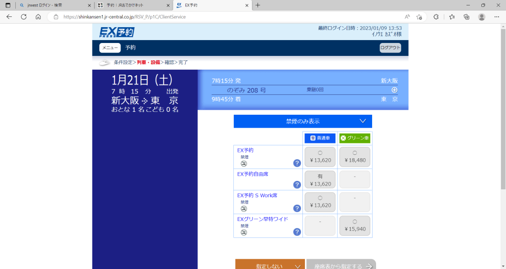 会員として予約するグリーン車と会員外で予約する普通車指定