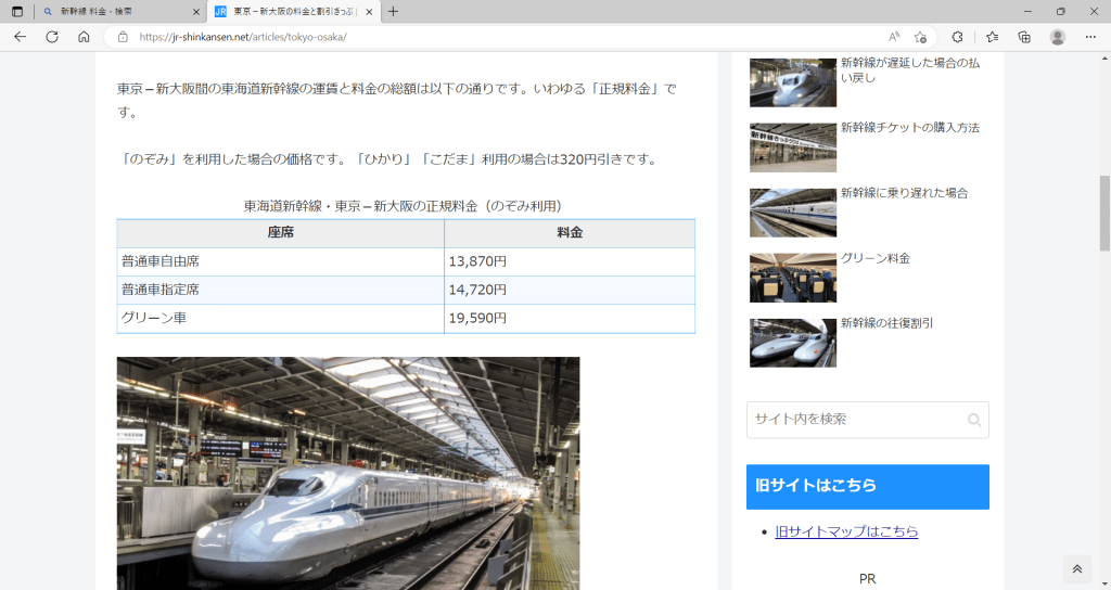 ↓東京駅~新大阪駅間の東海道新幹線の正規料金