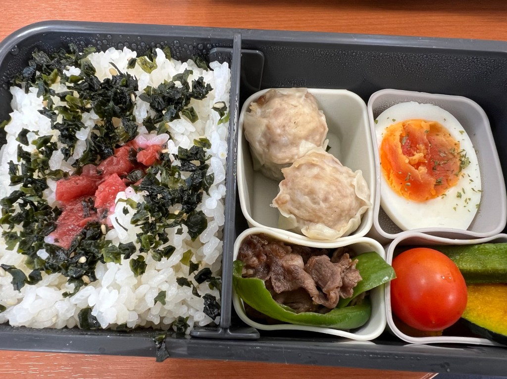 今日のお弁当は焼売、ゆで卵、かぼちゃ