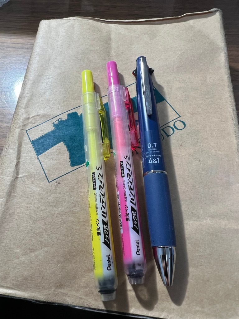 青のjetstreamと蛍光ペンでし。